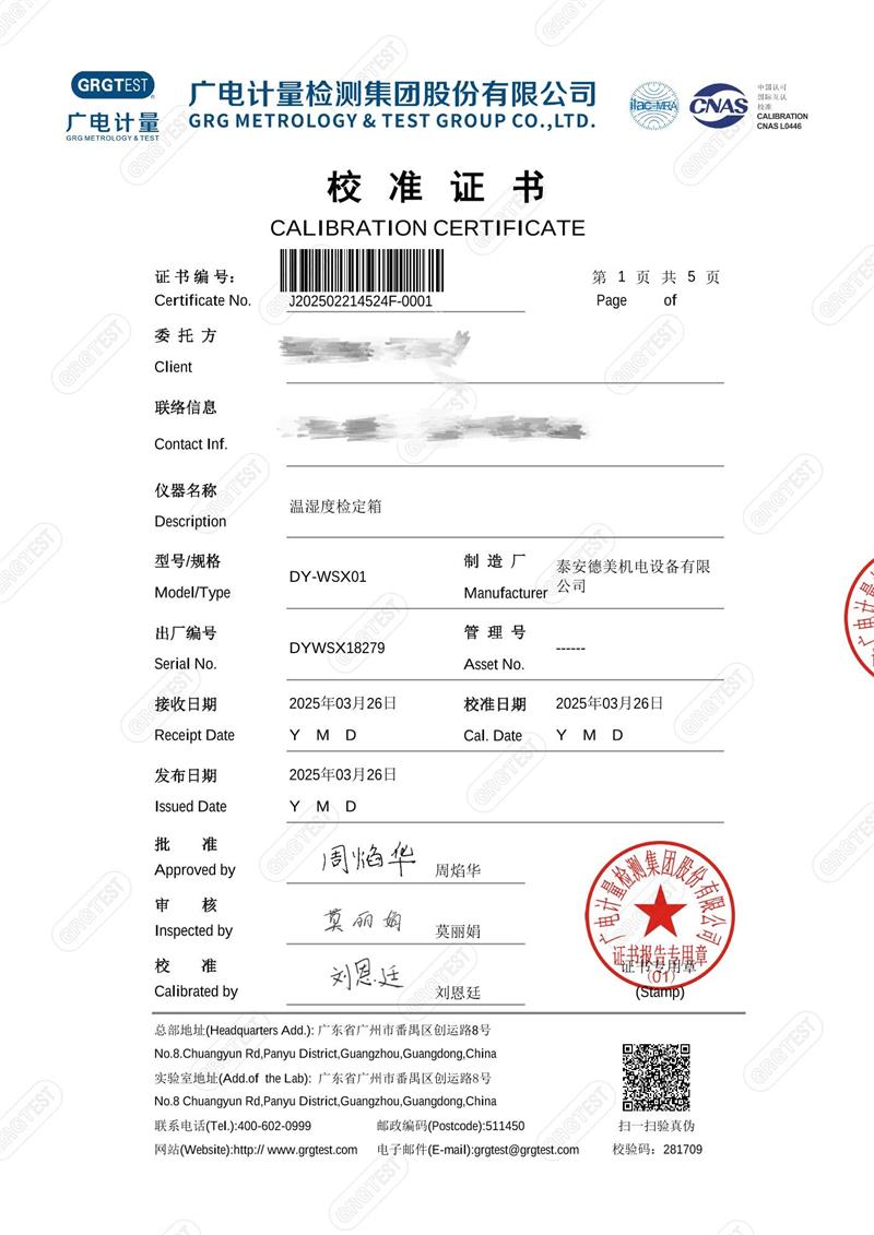 上一條:溫濕度檢定箱18276(-5~65℃)校準證書下一條:高精度數(shù)字溫度計-校準證書