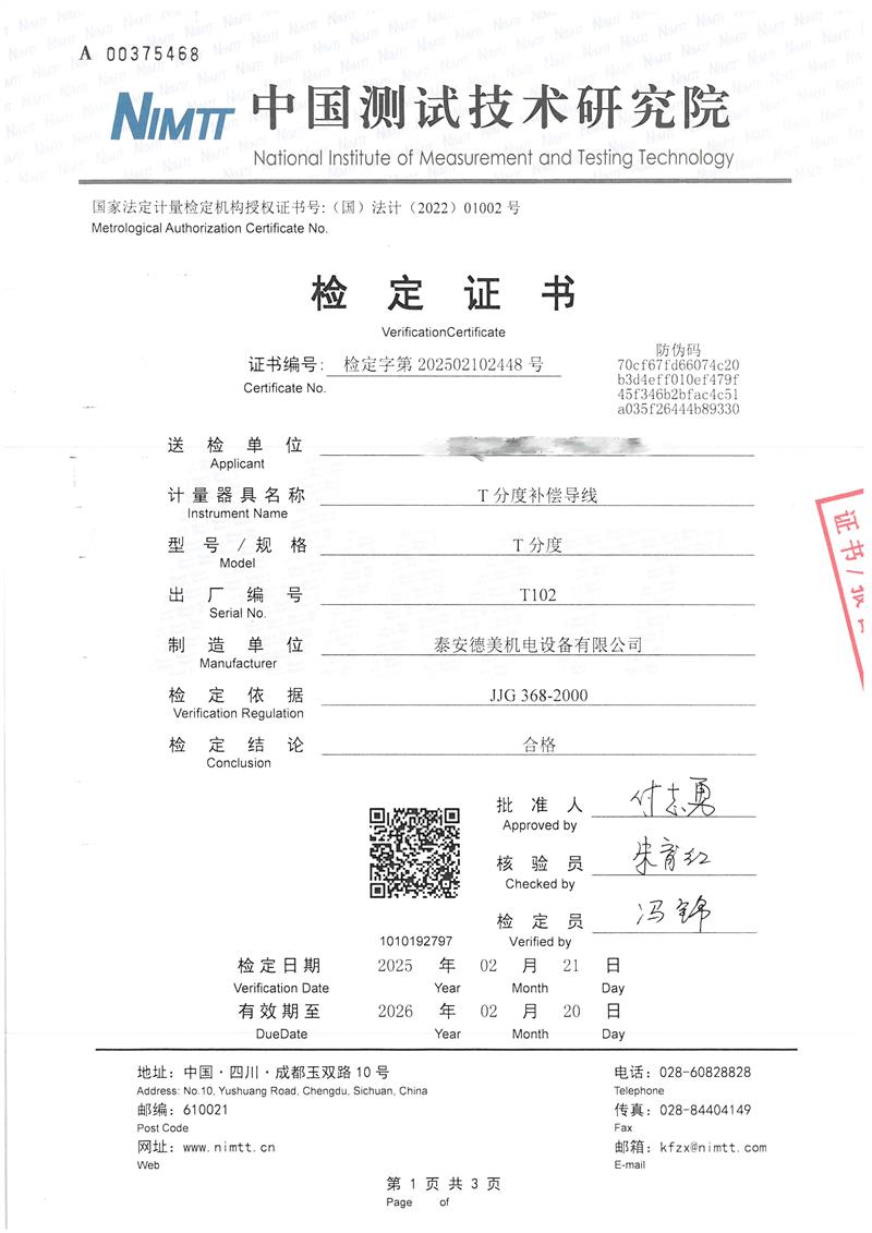 T分度補(bǔ)償導(dǎo)線檢定證書 2025-2-25 本文被閱讀 5986 次