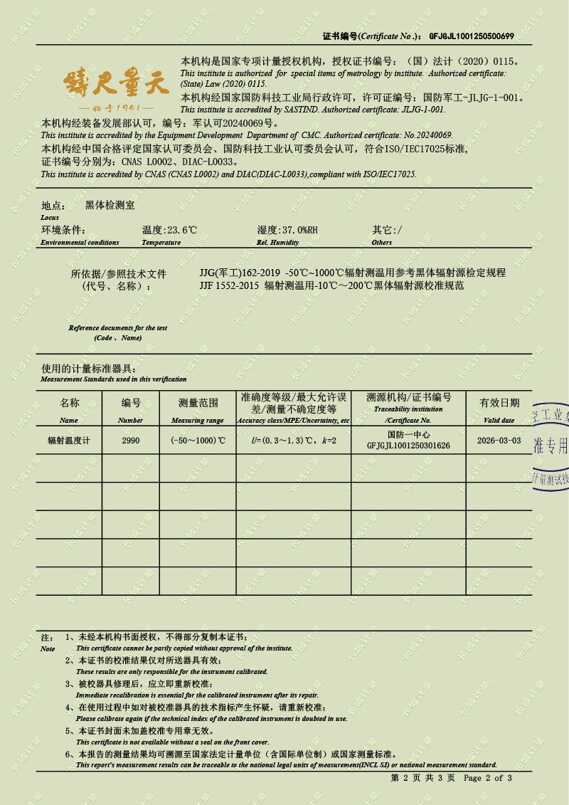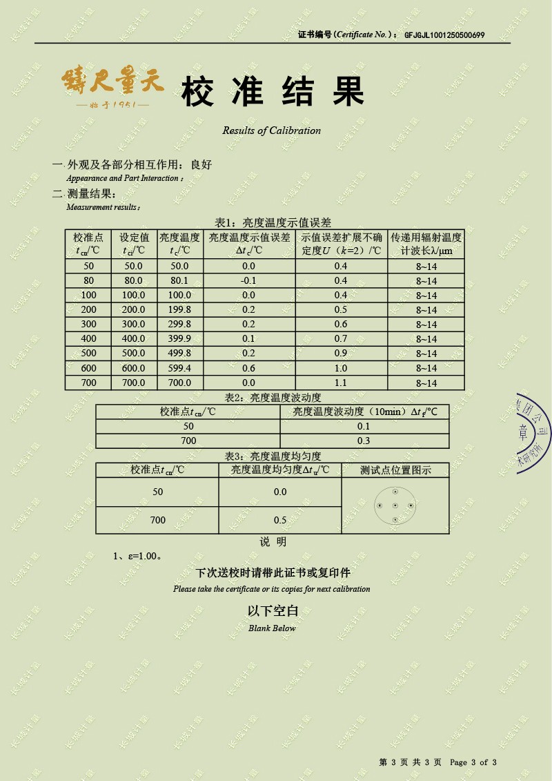 腔式黑體輻射源(50-700℃)校準證書 2025-5-9 本文被閱讀 4223 次