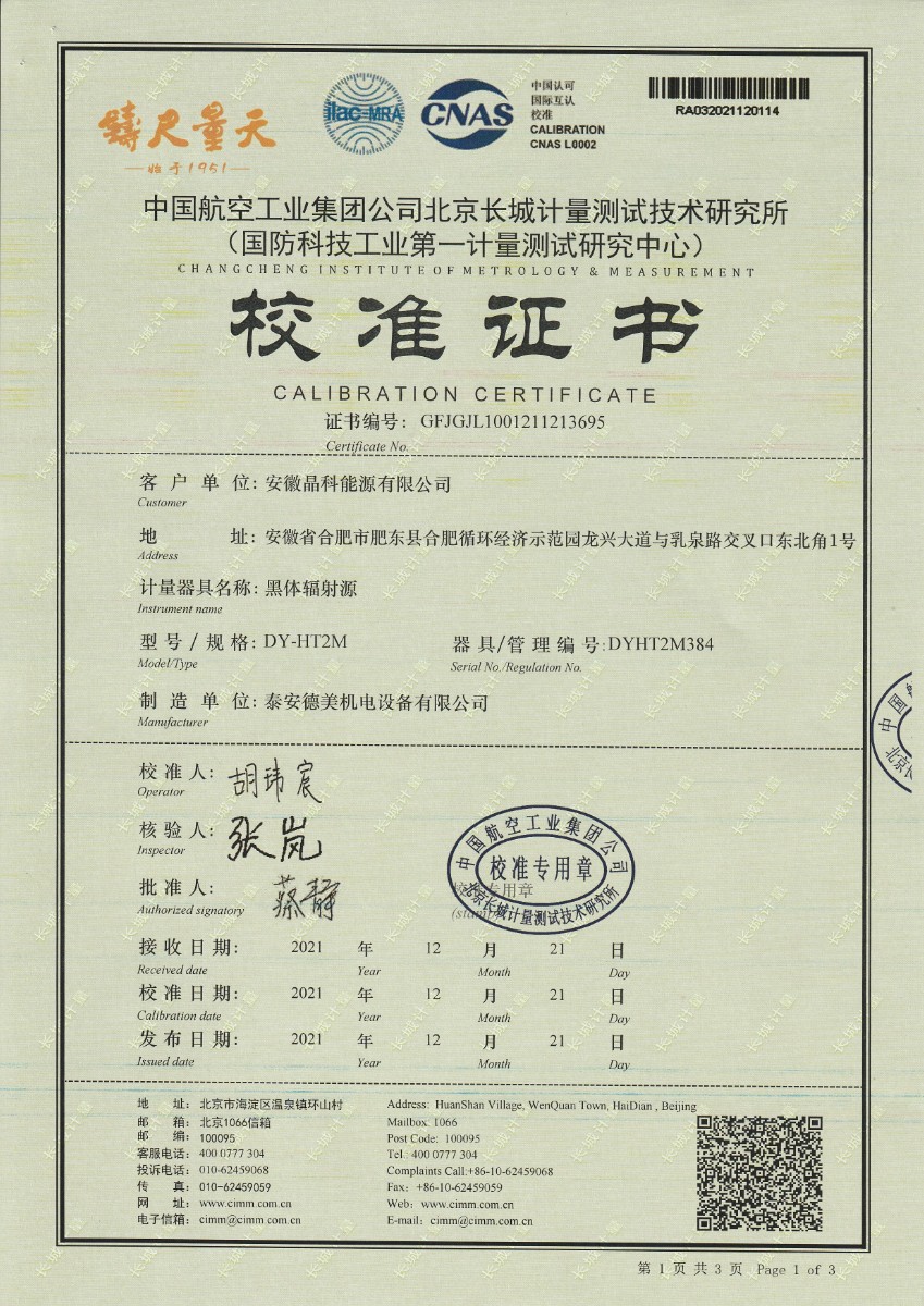 安徽晶科能源有限公司-黑體輻射源 2022-1-4 本文被閱讀 16594 次