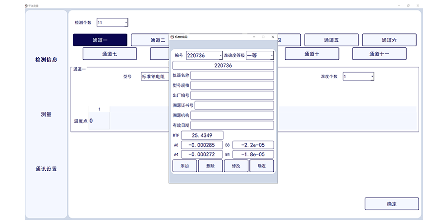 此套軟件可讀取1-11路標準通道的數(shù)字萬用表的電壓數(shù)值,標準溫度值,并一鍵轉(zhuǎn)換溫度值,并實現(xiàn)溫度波動度計算,可確定干體溫度校驗爐與標準器溫度的差值??梢绘I生成證書數(shù)據(jù)。