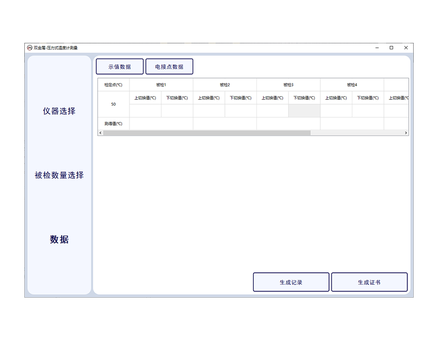 雙金屬溫度計軟件為DY-01熱工系統(tǒng)的配套軟件,可通過讀取雙金屬溫度計計壓力式溫度計數(shù)據(jù),記錄數(shù)據(jù)文件,并對數(shù)據(jù)文件進(jìn)行分析提取及計算,并可按照相關(guān)規(guī)程、規(guī)范輸出溫濕度場巡檢記錄及測試報告、證書等。