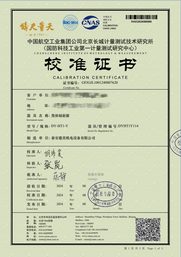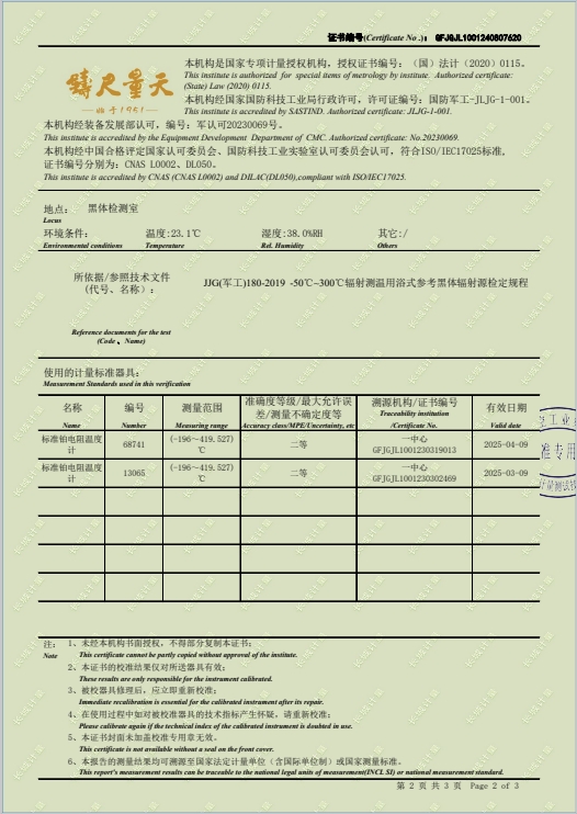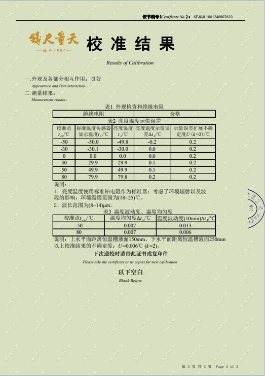 黑體輻射源-(-50~80(100℃))校準證書 2024-8-29 本文被閱讀 8745 次