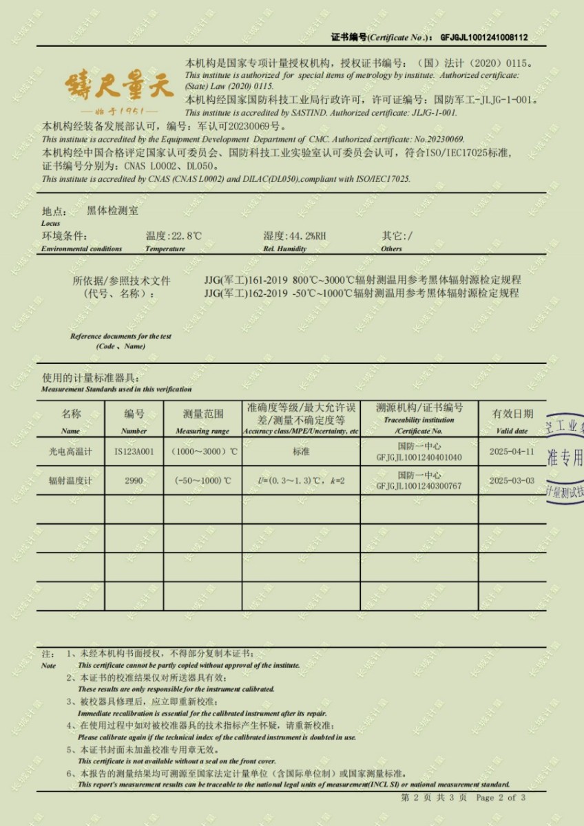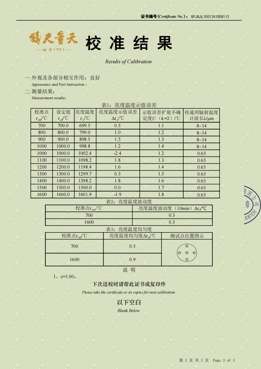 高溫黑體爐(700-1600℃)校準證書 2024-11-6 本文被閱讀 7486 次