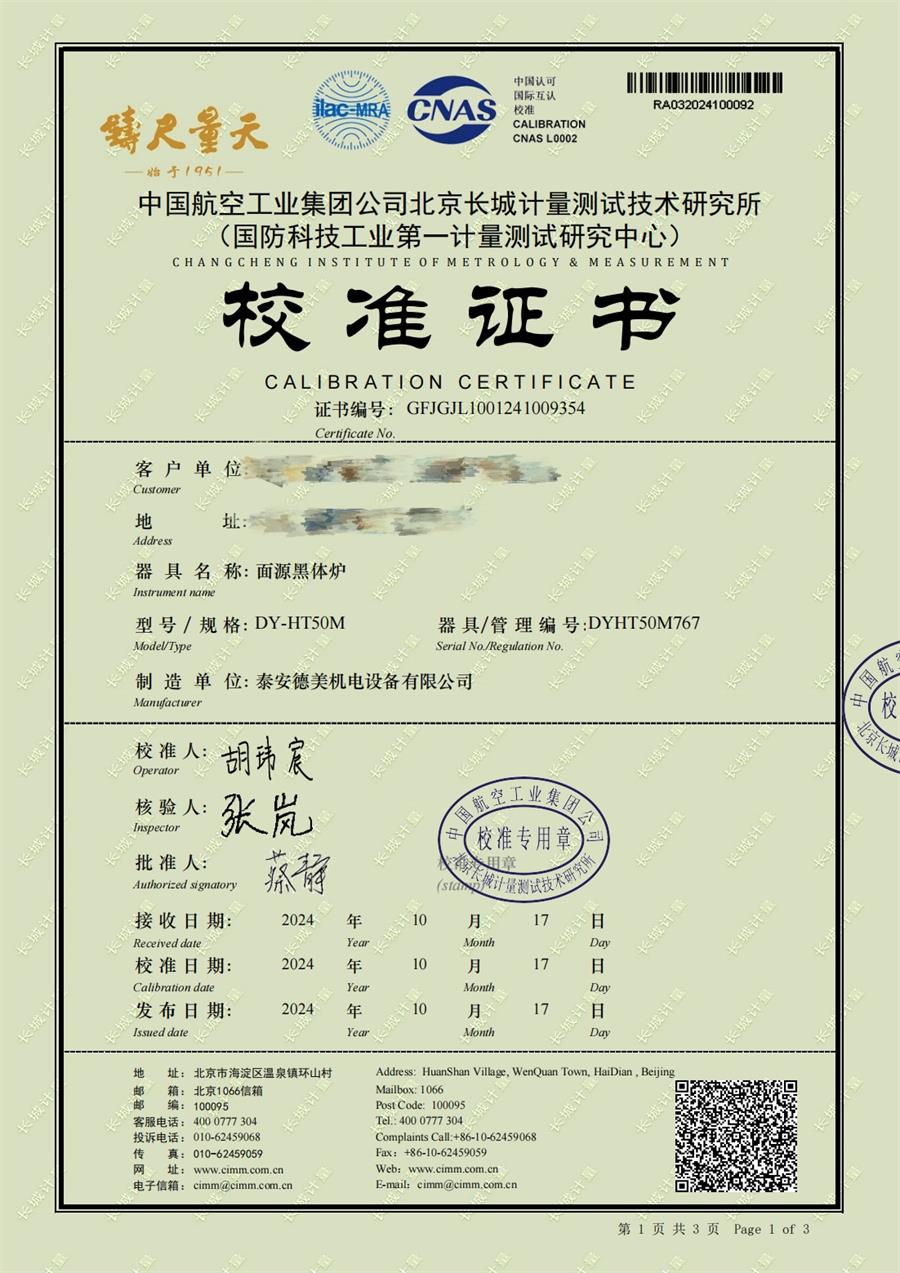 面源黑體爐(+5-300℃)校準證書 2024-11-6 本文被閱讀 7887 次