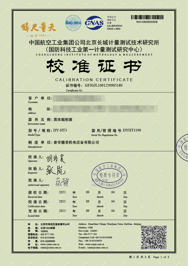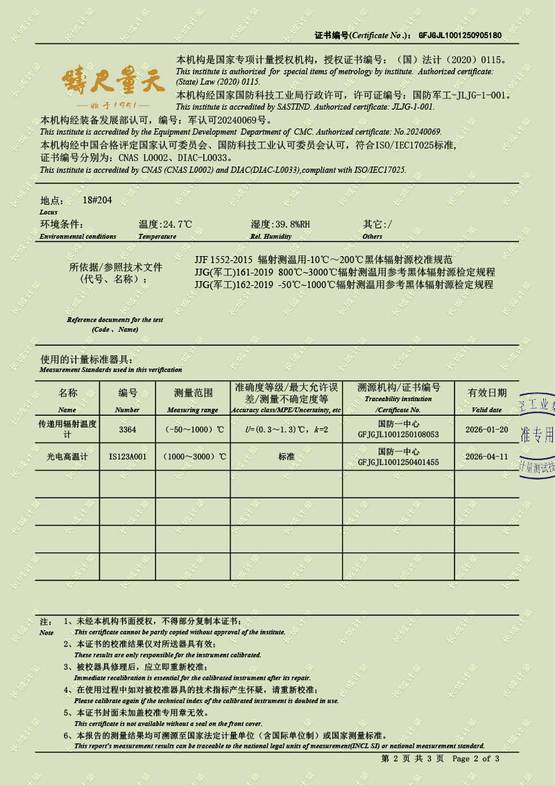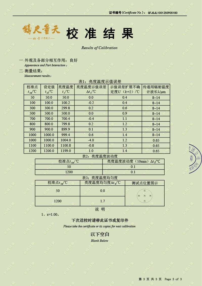 黑體輻射源(50-1200℃)校準證書 2025-9-22 本文被閱讀 2496 次