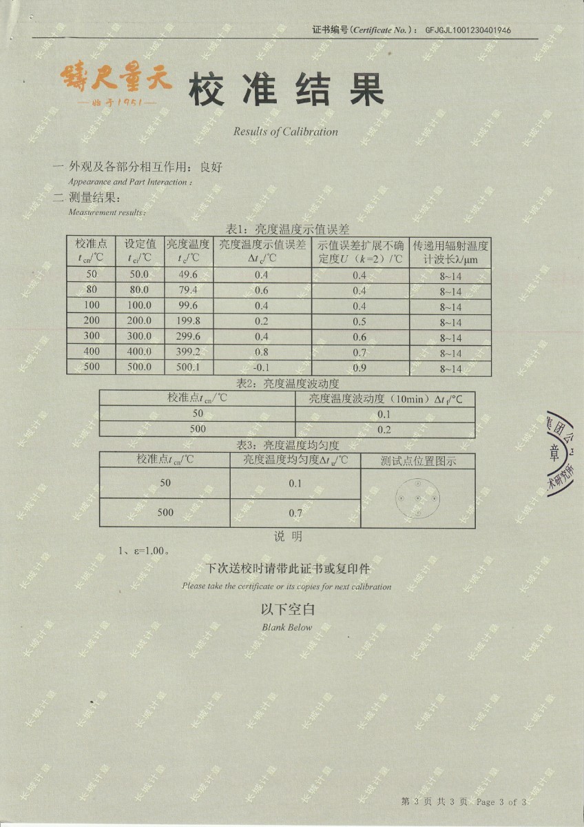 浙江弘志計量測試有限公司 黑體輻射源 校準證書 2023-5-4 本文被閱讀 14756 次