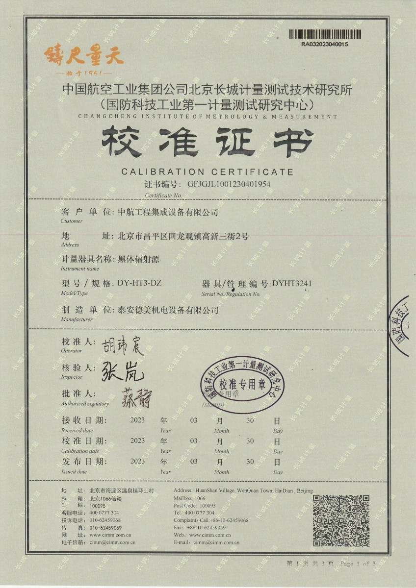 上一條:中航工程集成設(shè)備有限公司 黑體輻射源 校準(zhǔn)證書 (1)下一條:高精度數(shù)字溫度計(jì)-校準(zhǔn)證書