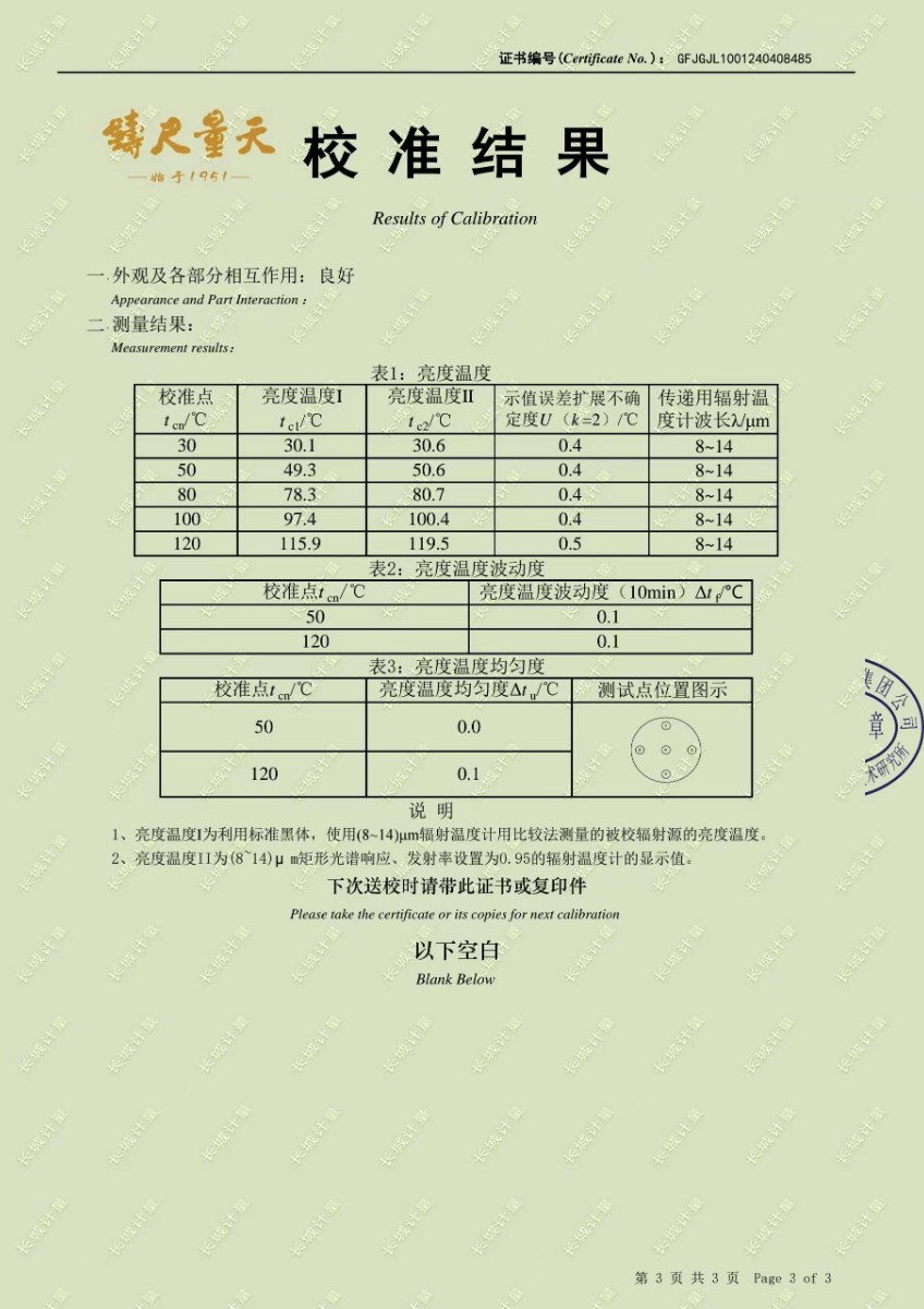 小尺寸高精度中溫黑體校準證書 2024-4-24 本文被閱讀 8570 次