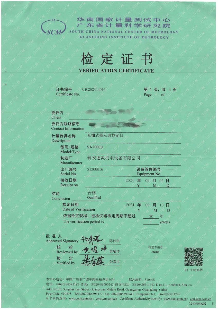 光柵式指示表檢定儀檢定證書 2024-9-20 本文被閱讀 7439 次