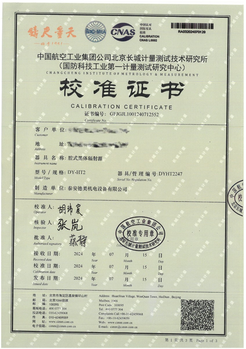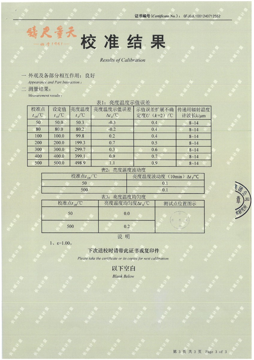 | 上一條:面源黑體爐(室溫+5℃~400℃)校準(zhǔn)證書 | 下一條:高精度數(shù)字溫度計(jì)-校準(zhǔn)證書 |