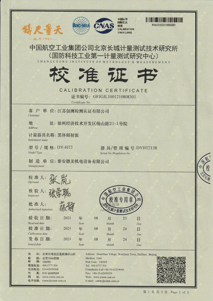江蘇創(chuàng)測檢測認證有限公司-黑體輻射源 2021-9-1 本文被閱讀 19022 次
