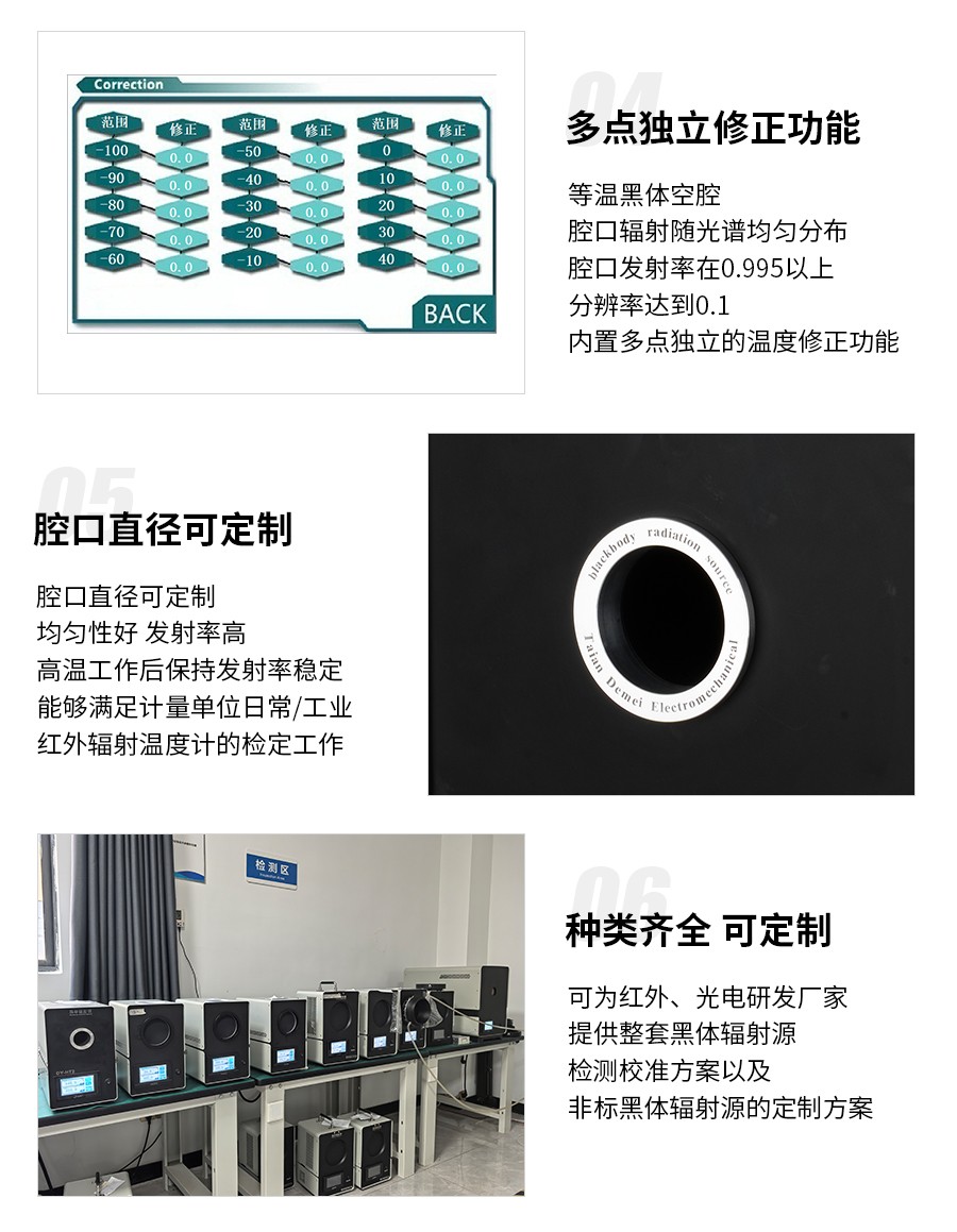 標(biāo)準(zhǔn)黑體作為標(biāo)準(zhǔn)輻射源,主要用于校準(zhǔn)輻射溫度計(jì)、紅外溫度計(jì)和輻射溫度傳感探測(cè)器。我公司目前具有先進(jìn)的黑體技術(shù),產(chǎn)品種類(lèi)全、溫度范圍寬的黑體系列產(chǎn)品。產(chǎn)品體積小、重量輕、便于攜帶,不僅適合各級(jí)計(jì)量機(jī)構(gòu)實(shí)驗(yàn)室校準(zhǔn)輻射溫度計(jì)使用,同時(shí)可以用于現(xiàn)場(chǎng)校準(zhǔn)。