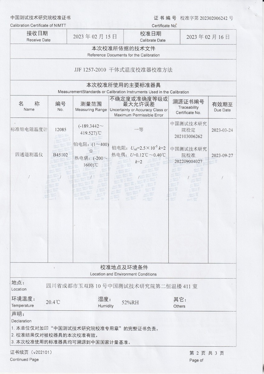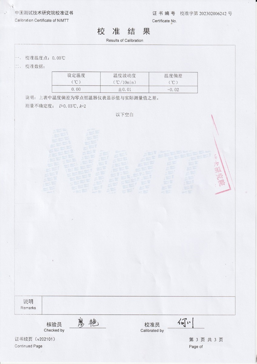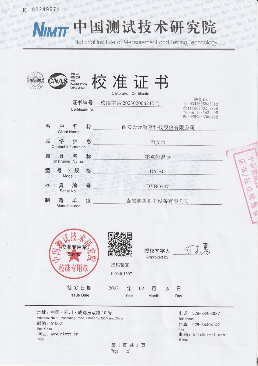 西安天元航空科技股份有限公司 零點恒溫器 校準證書 2023-2-25 本文被閱讀 14072 次
