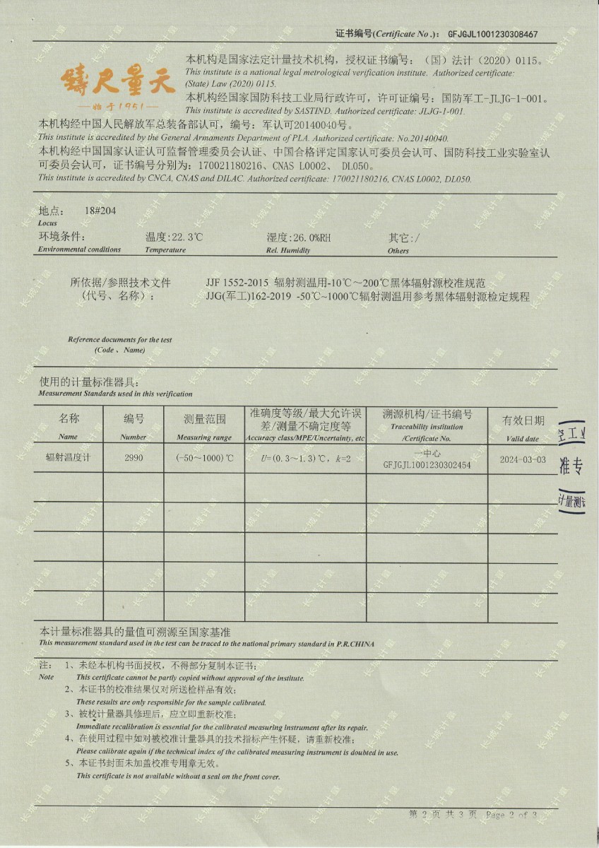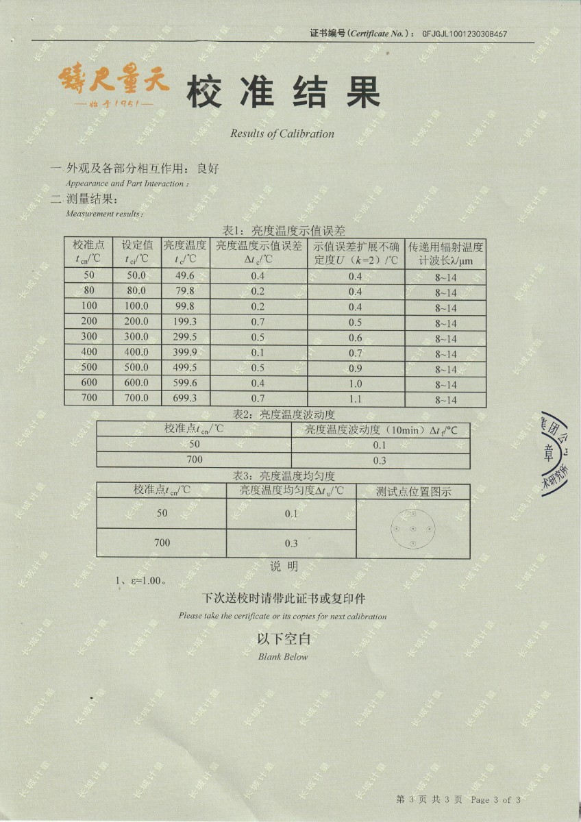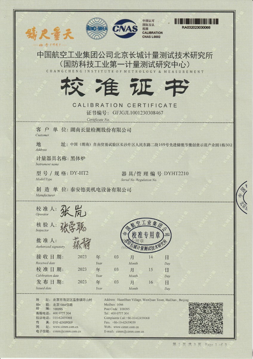 湖南長(zhǎng)量檢測(cè)股份有限公司 黑體爐 校準(zhǔn)證書 2023-3-31 本文被閱讀 13457 次