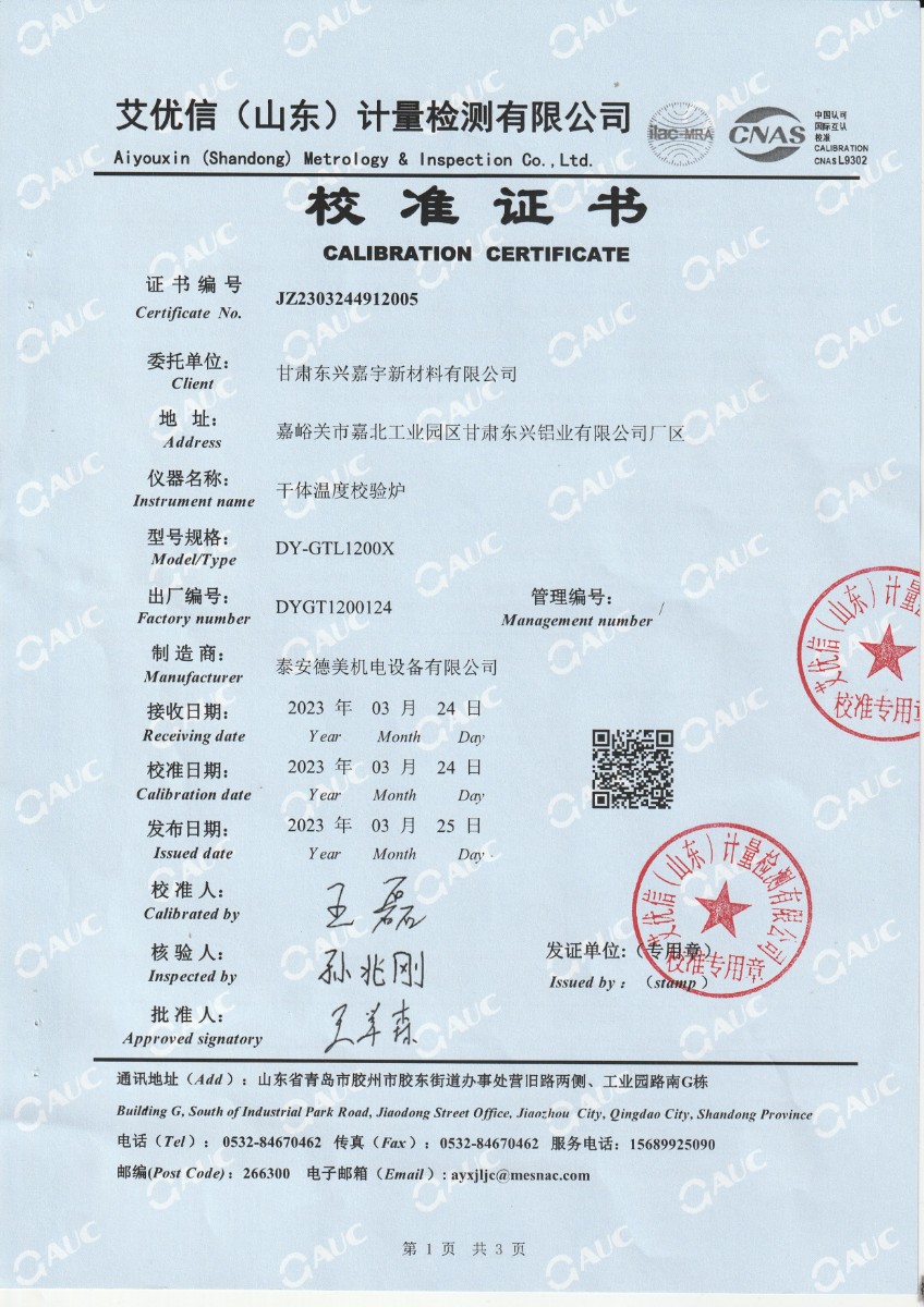 甘肅東興嘉寧新材料有限公司 干體溫度校驗爐 校準證書 2023-3-31 本文被閱讀 14559 次