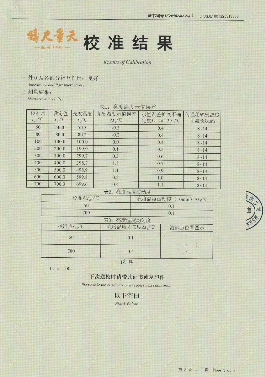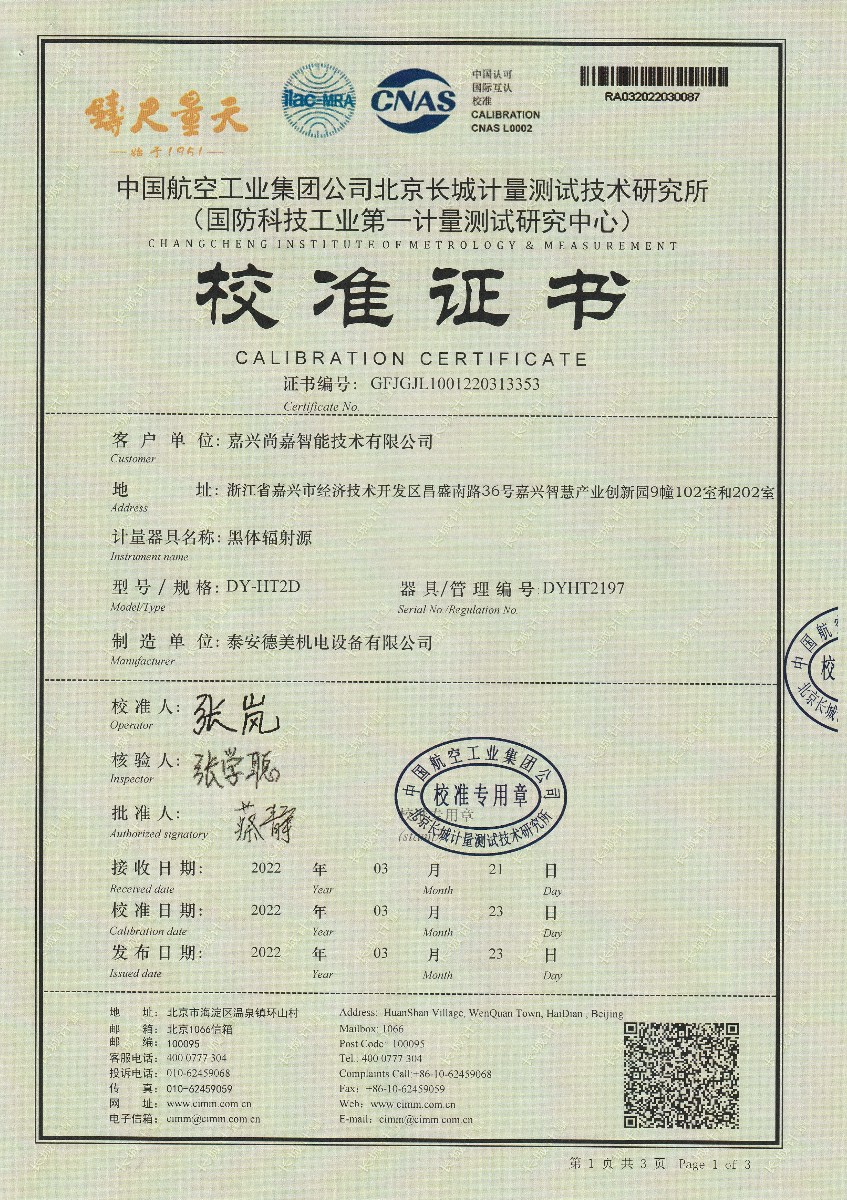 | 上一條:嘉興尚嘉智能技術(shù)有限公司-黑體輻射源(DY-HT1A) | 下一條:高精度數(shù)字溫度計-校準(zhǔn)證書 |
