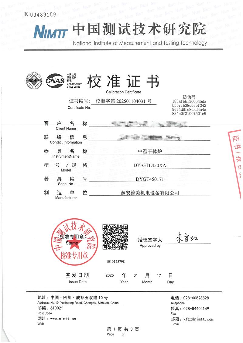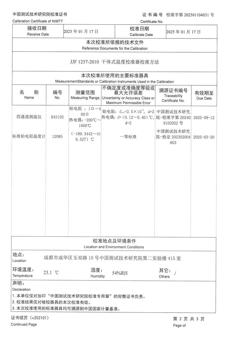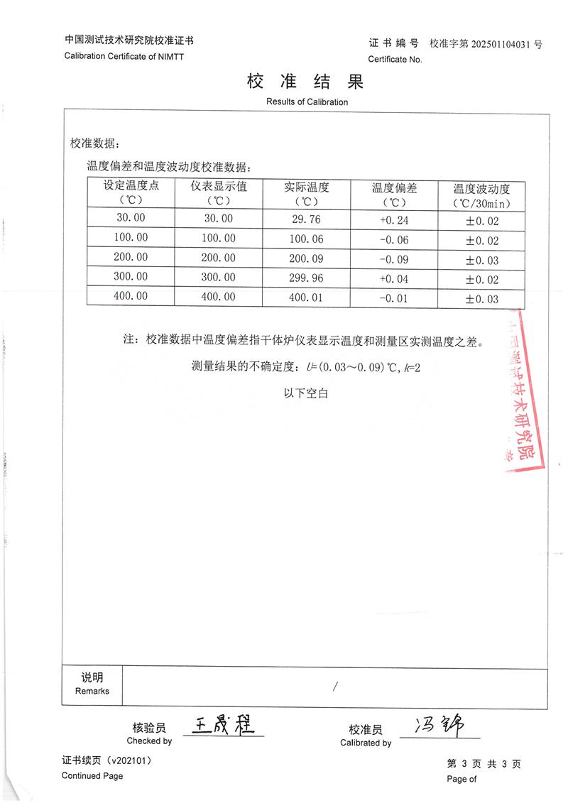 中溫干體爐(室溫+5~400℃)校準(zhǔn)證書 2025-1-20 本文被閱讀 6339 次
