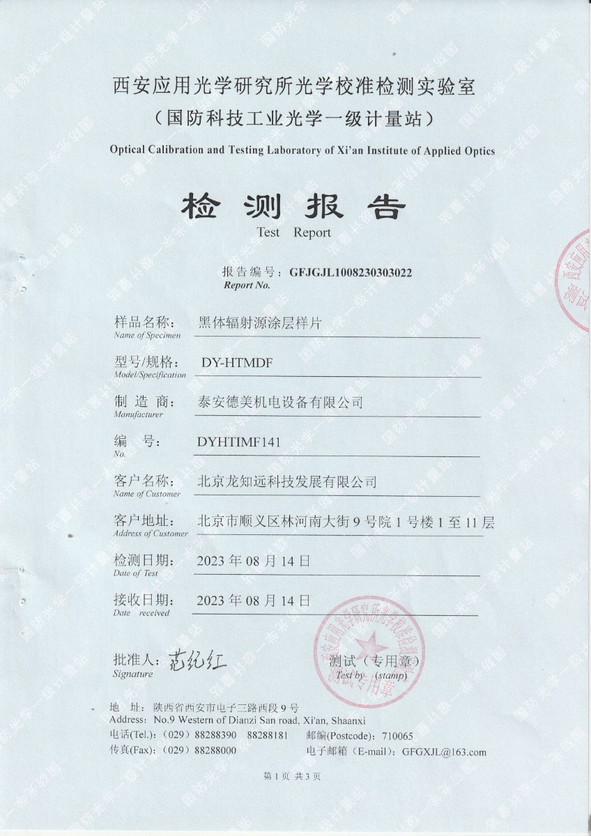 | 上一條:北京龍知遠(yuǎn)科技發(fā)展有限公司-黑體輻射源涂層樣片DYHT1MF140檢測報告 | 下一條:高精度數(shù)字溫度計-校準(zhǔn)證書 |